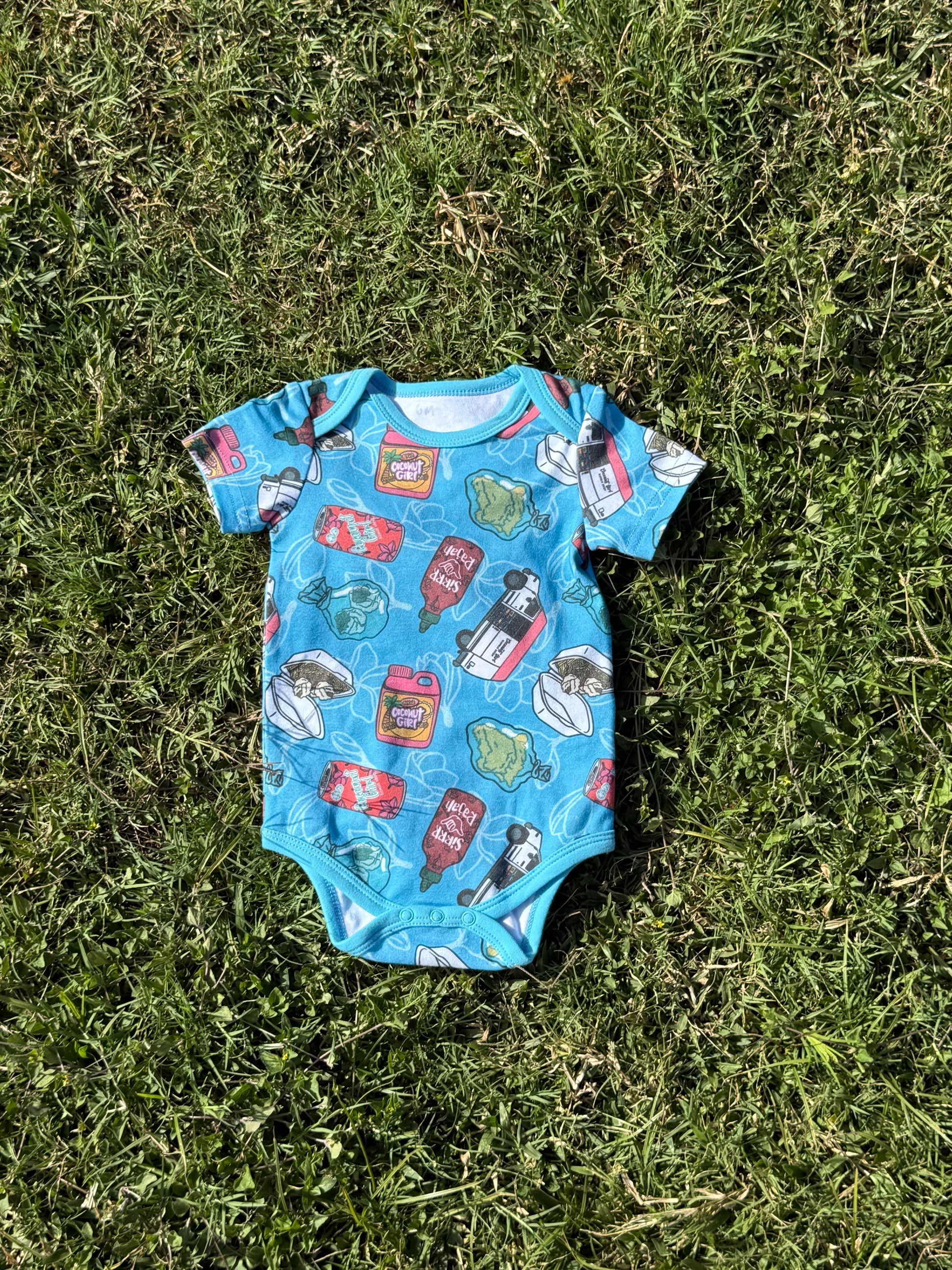 By popular demand our Manapua Truck in both pink and blue colorways is now available on our new all over print onesies